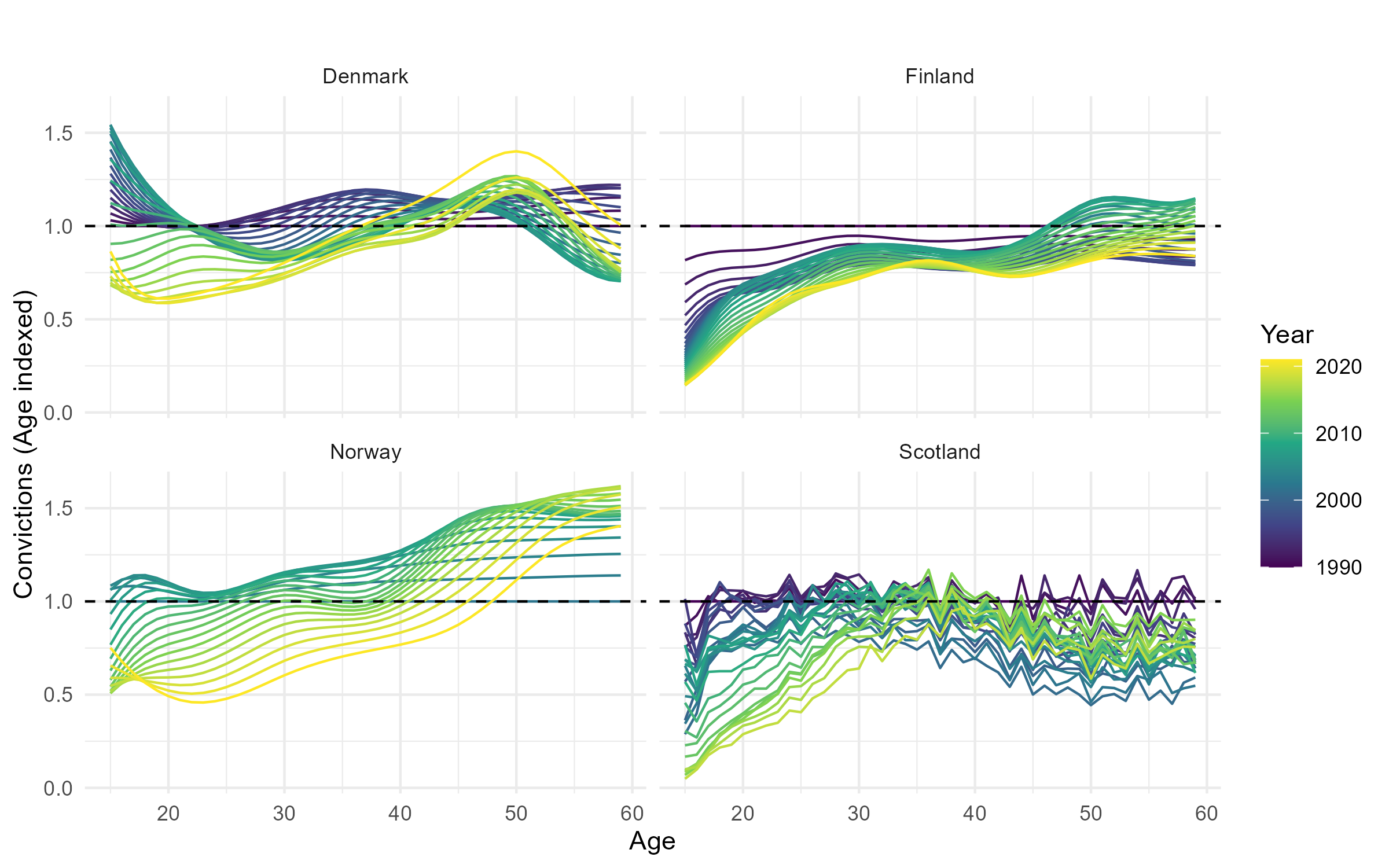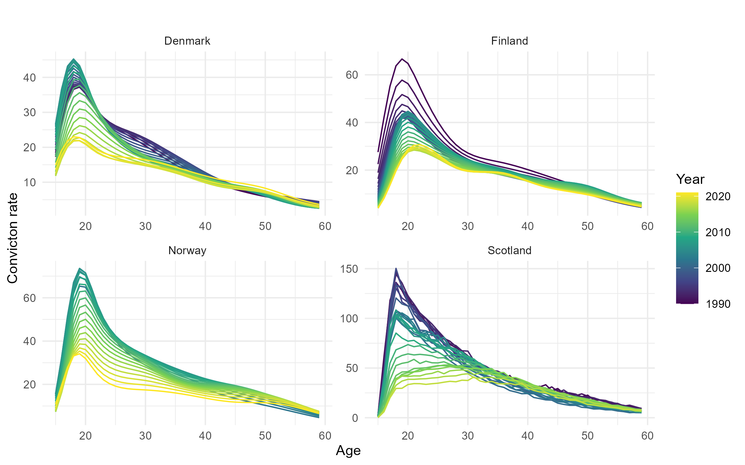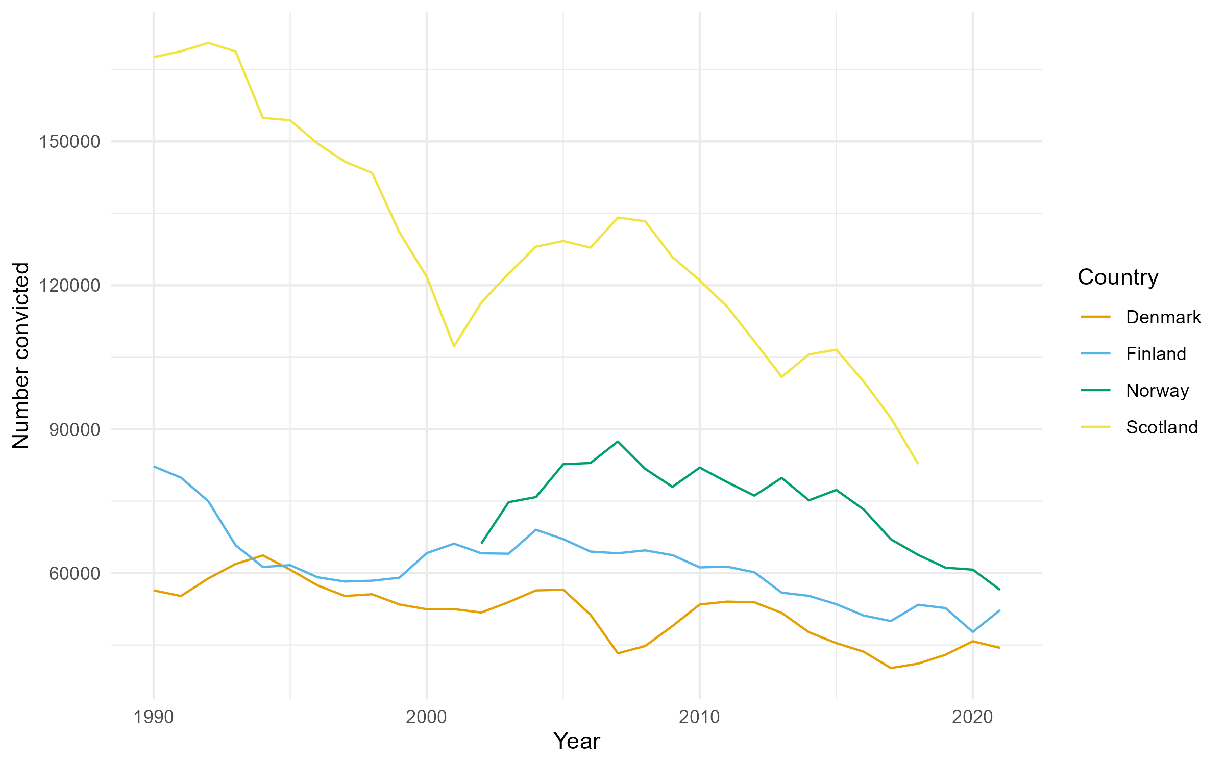 Total conviction numbers by age for Scotland, Norway, Finland and Denmark