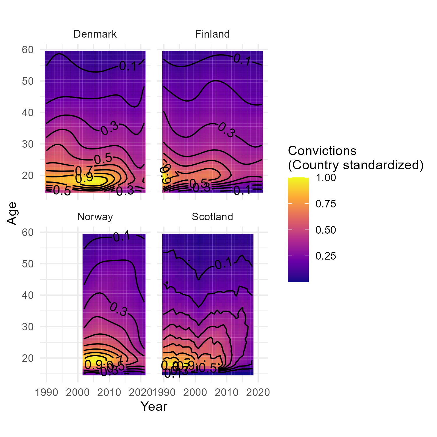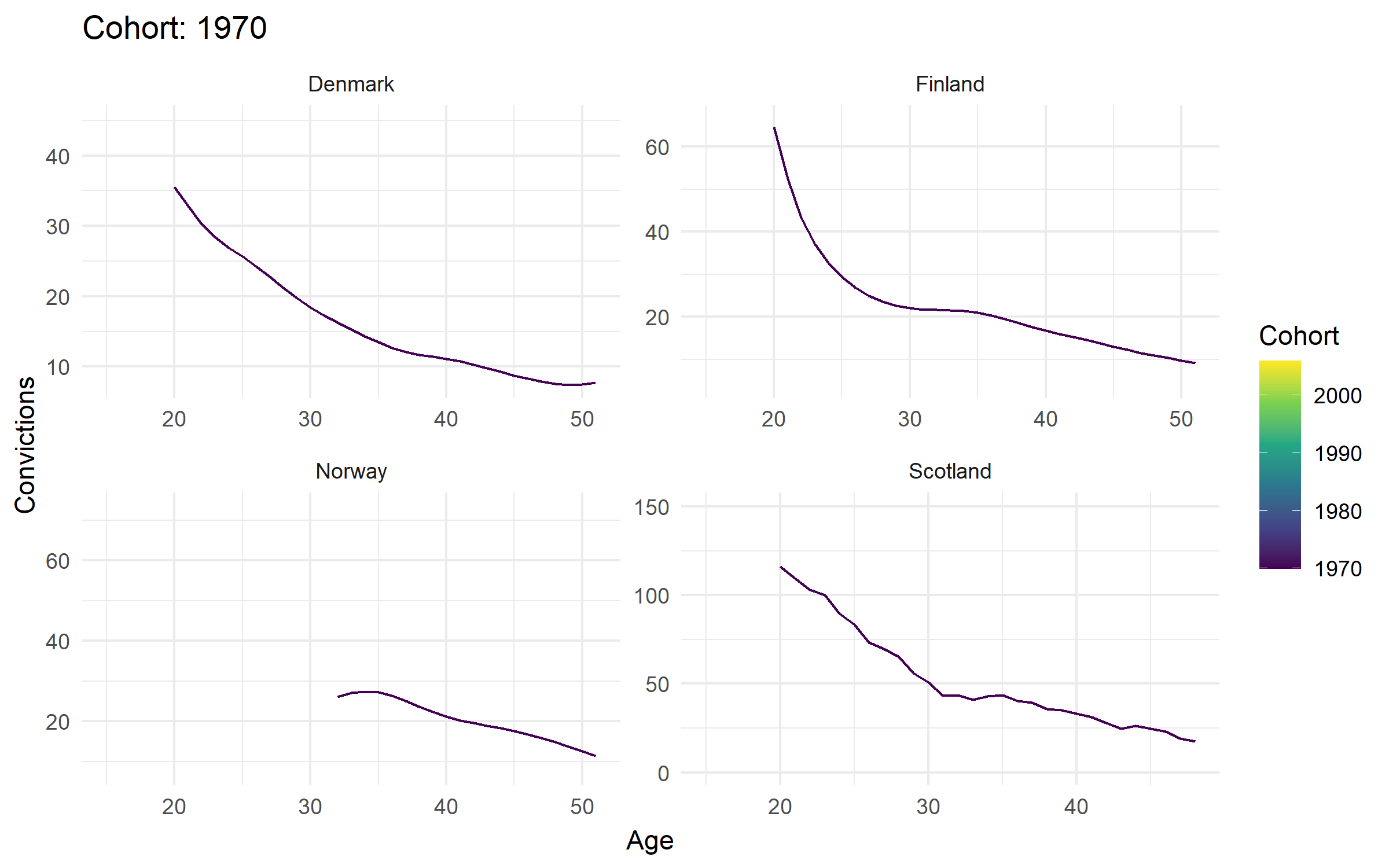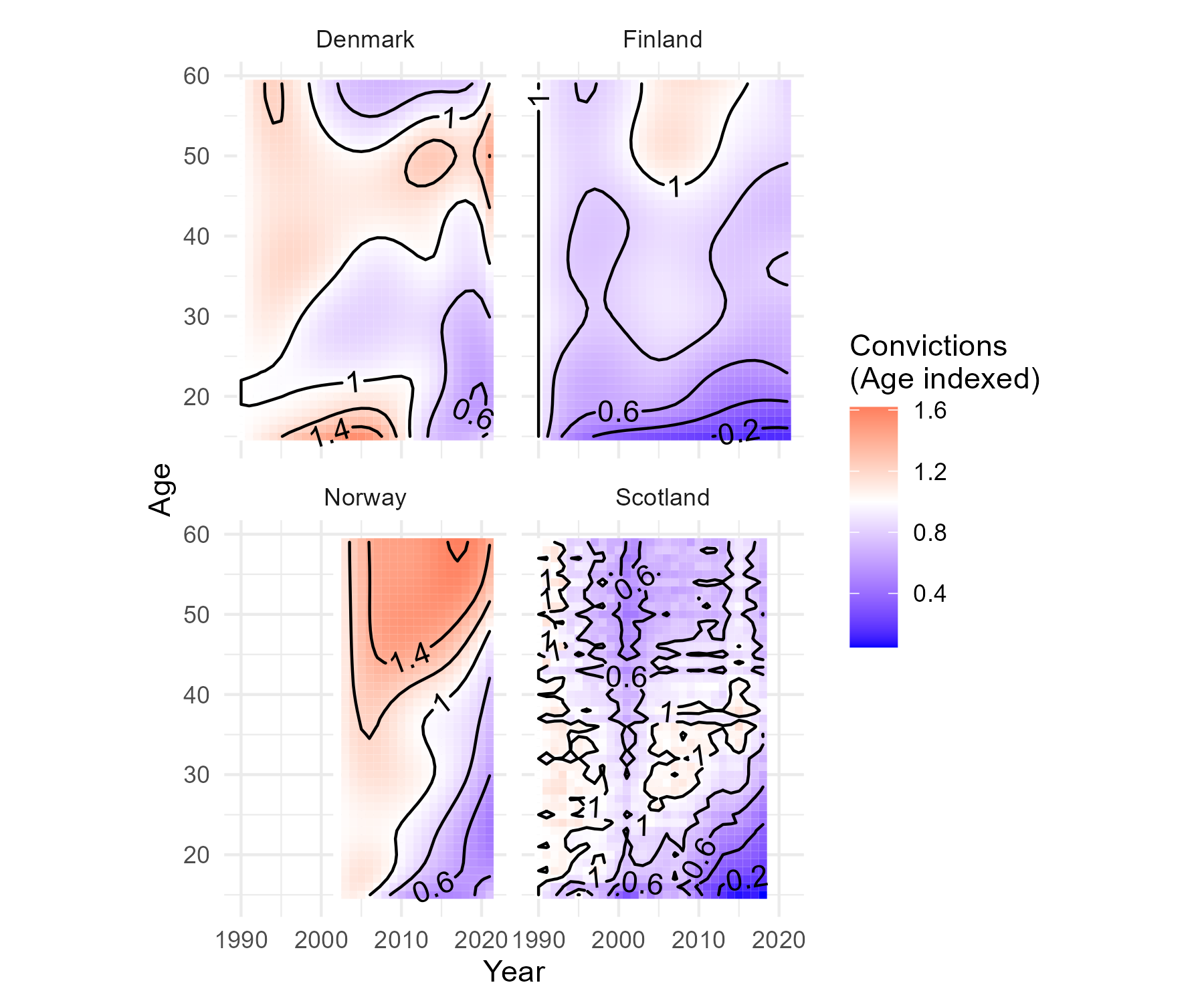 Total conviction numbers by age for Scotland, Norway, Finland and Denmark