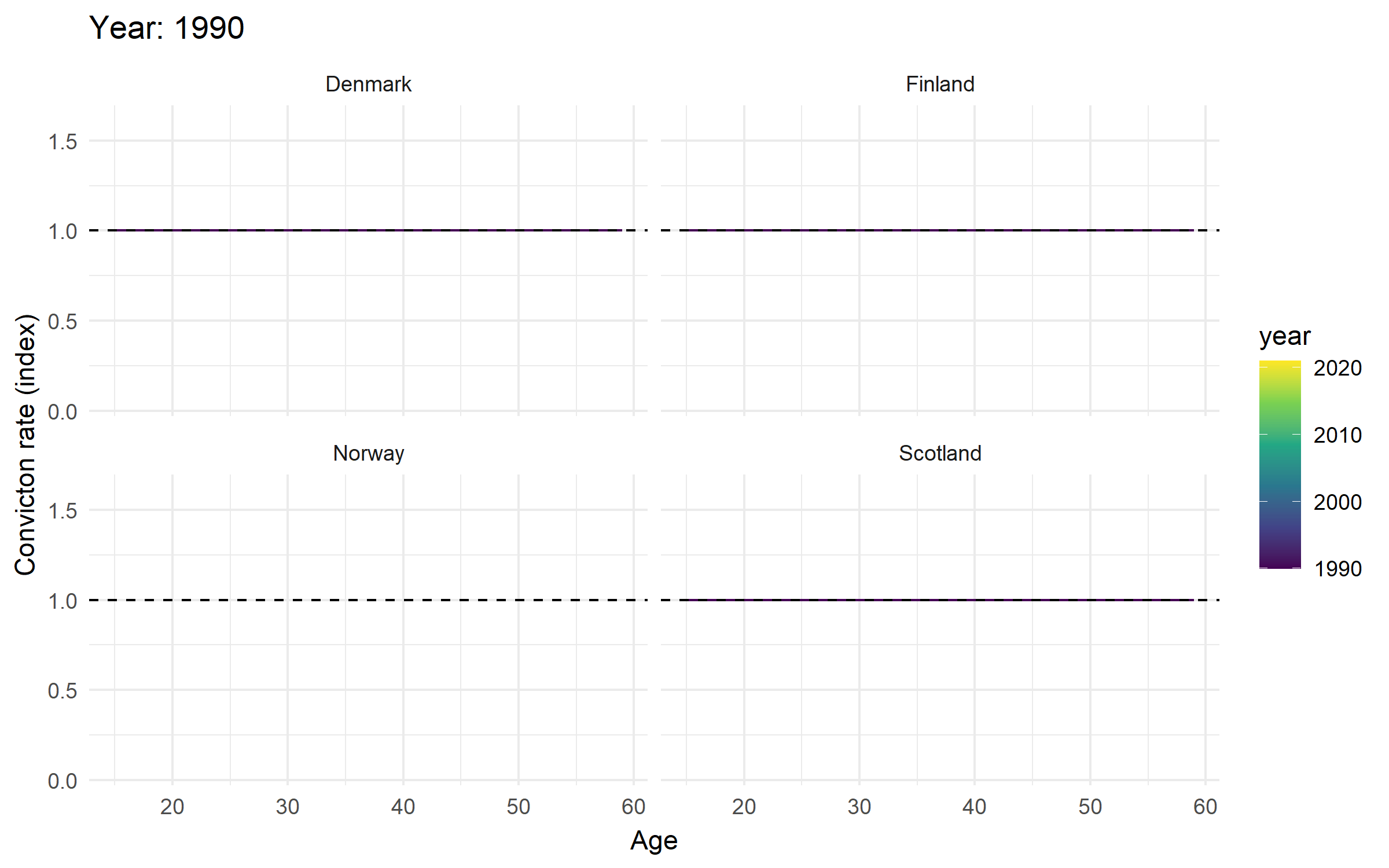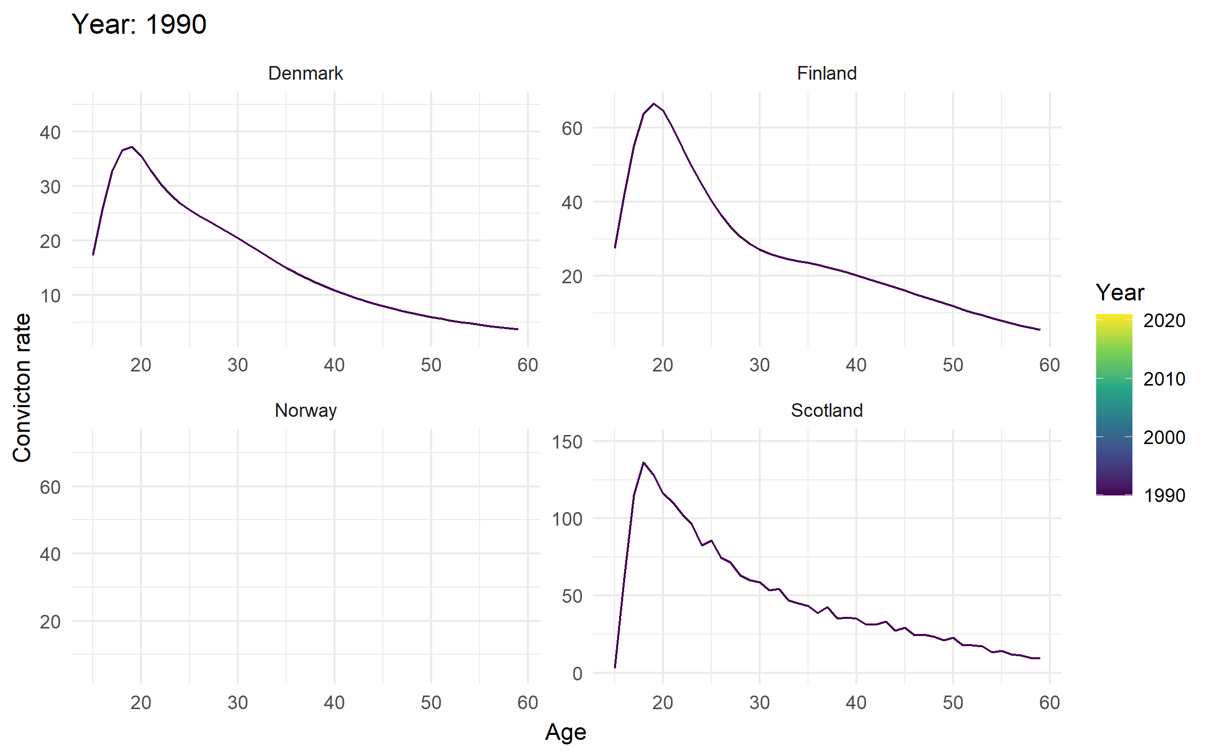 Because PCLM models convictions data and population data together to estimate a smooth surface of conviction rates, so you probably shouldn’t look for disruptions in the time series (policy shocks or what have you)